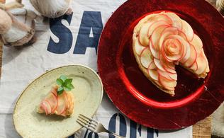7. 焼きあがったら半月切りにしたりんごを外側からぐるっと並べる。中心は丸めて高さを出すと、薔薇のような見た目のアップルパイになる。