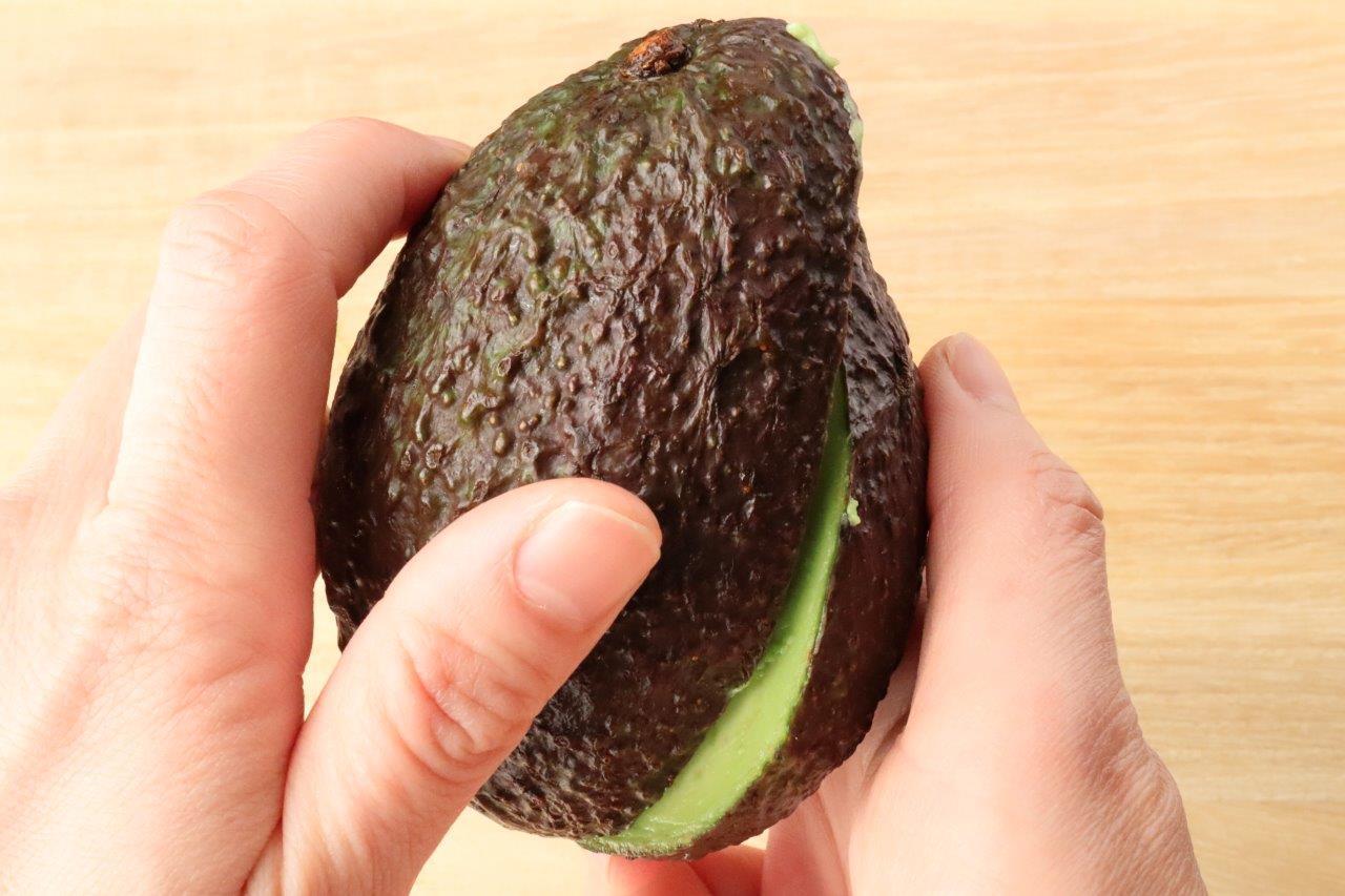 アボカドは縦に包丁を入れ、種に沿ってぐるりと一周切り込みを入れます。