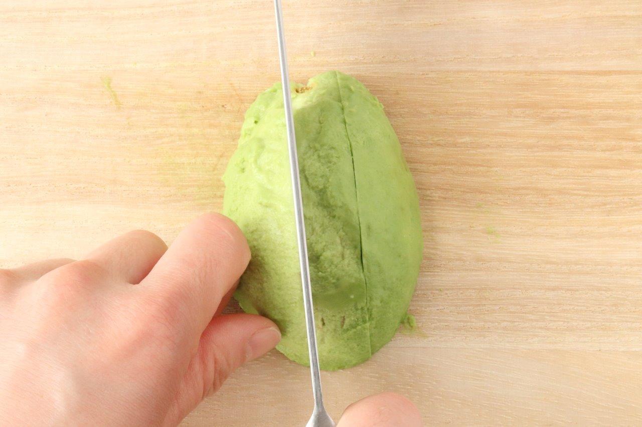 アボカドが硬く、上記の方法では実を外しにくそうな場合は、皮を剥いてから切るときれいに切れます。