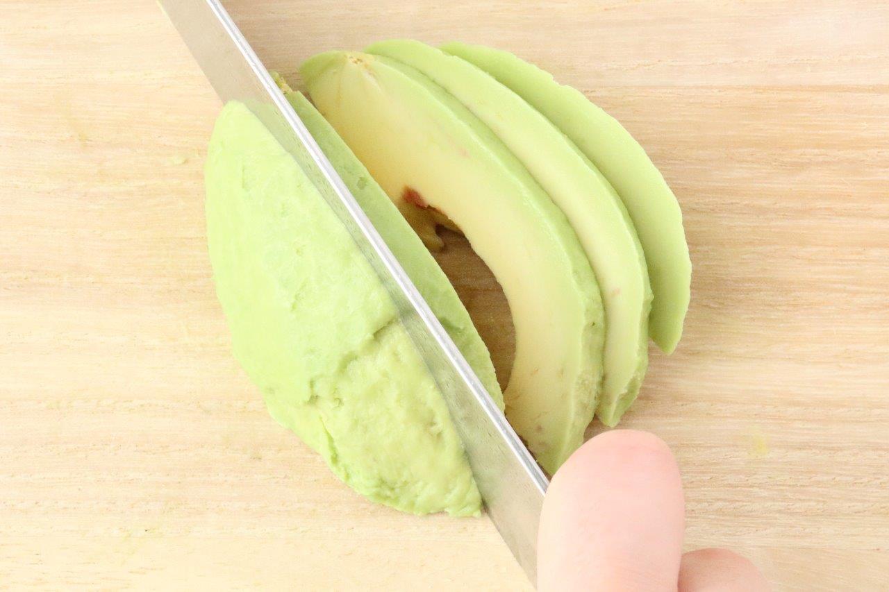 種を取り皮を剥いたアボカドを縦方向に置き、5mm幅程度に切ります。