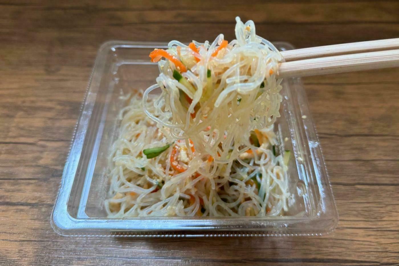 成城石井自家製の、鶏肉と特製だれを使用した春雨サラダです。開封するとお酢と胡麻の良い香りが漂い食欲をそそりますが、ツンとした強い刺激臭はそれほど感じません。