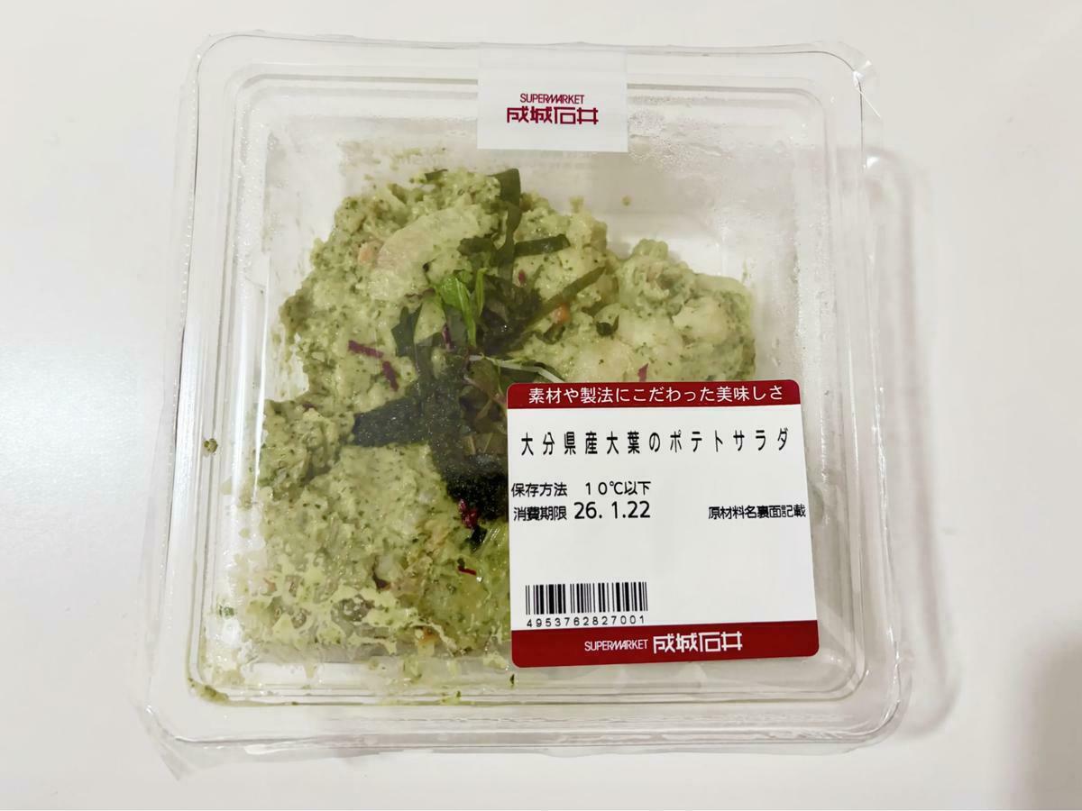 成城石井で見つけた「自家製 大分県産大葉のポテトサラダ」は、一般的なポテトサラダのイメージを覆す鮮やかな緑色が特徴です。