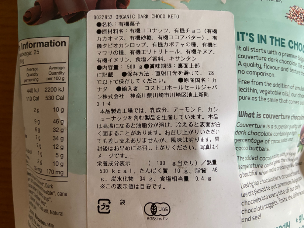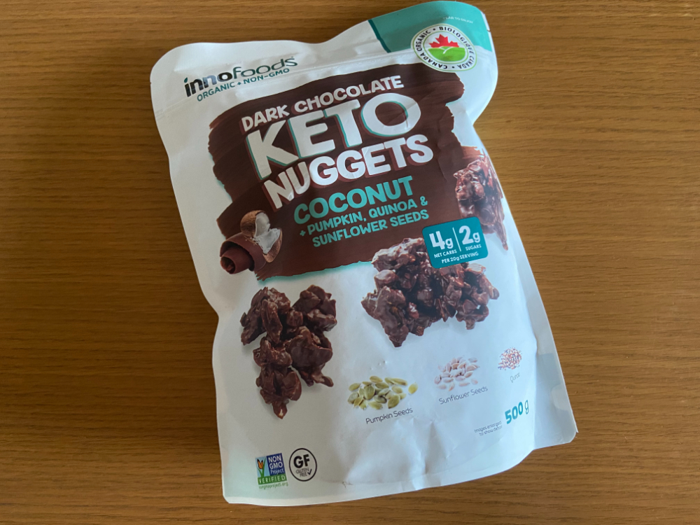 コストコに登場した「オーガニックダークチョコレートケトナゲッツ」は糖質を抑えたケトジェニックダイエット向けのチョコレート菓子。カナダのイノフーズというオーガニック製品を取り扱うメーカーが製造しています。