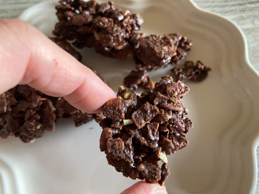 500gの袋はジップタイプなので保存も便利。お皿に取り出してみるとナッツがぎっしり入ったチョコレートが。