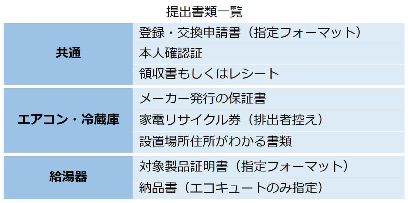 また、各家電別でそれぞれの申請に必要な書類は次の通りです。