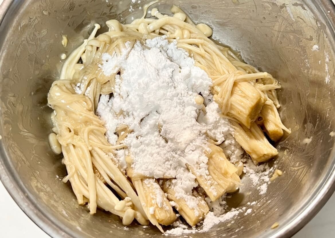 えのきに味が染み込むように馴染ませたら、片栗粉を加えていきましょう♪