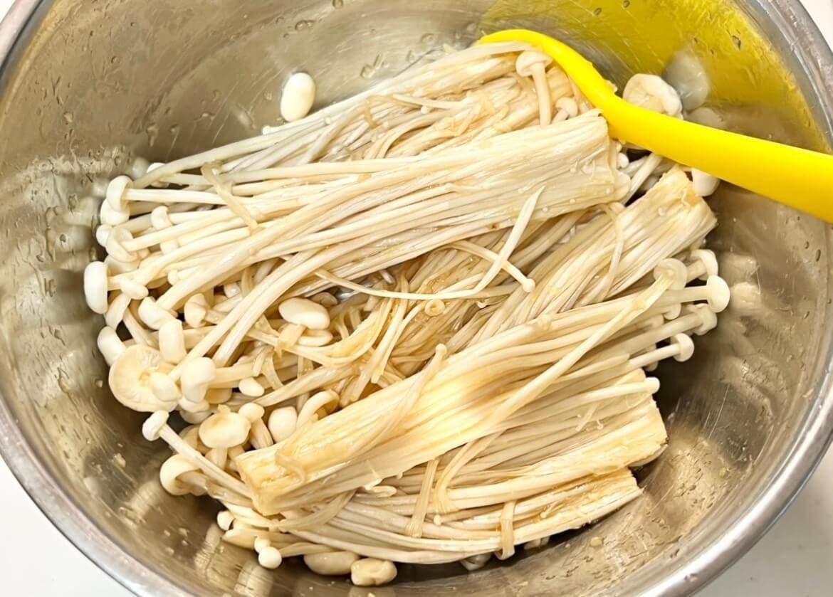 調味料が混ざったら、先ほどさいたえのきを絡めていきます。