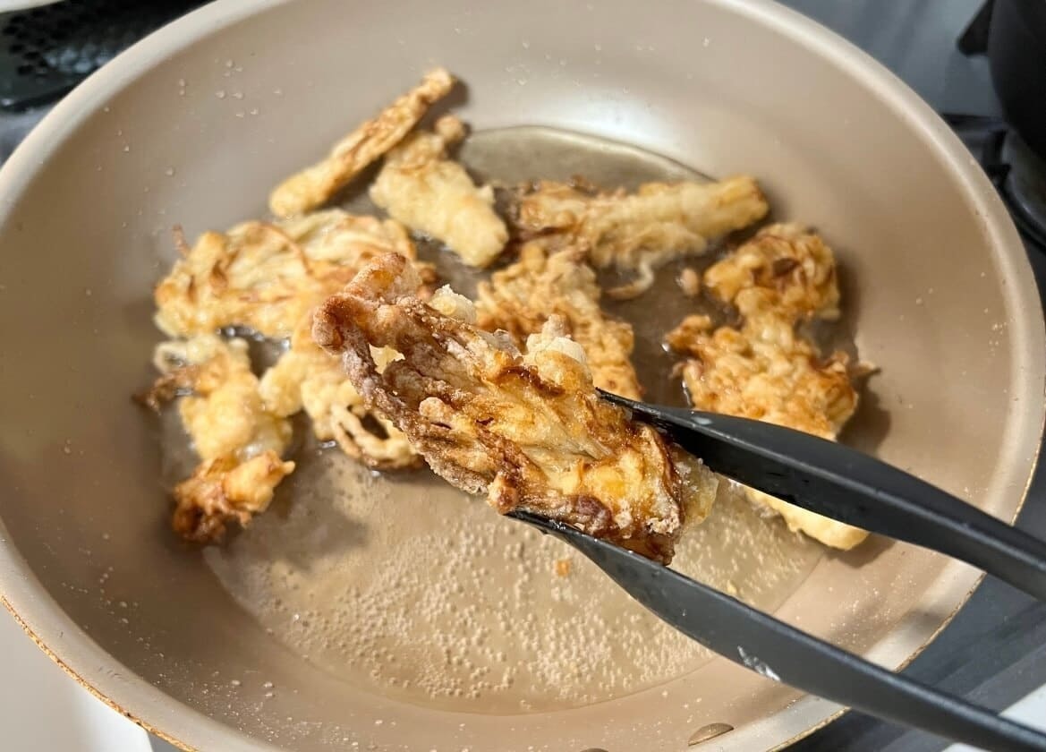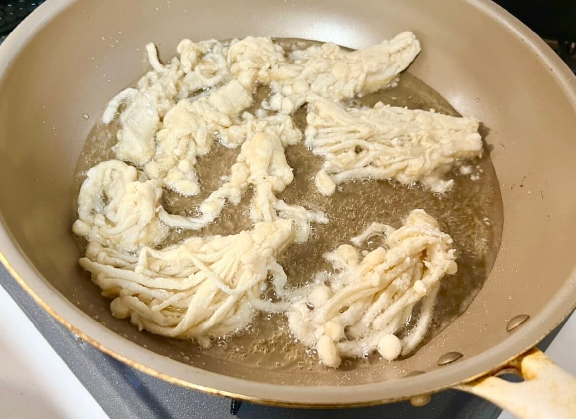 フライパンに1㎝ほどの油を火にかけて170℃くらい(菜箸を入れると大きめの泡が上がってくる程度が目安です)に温まったら、えのきを弱火〜中火で片面ずつ揚げ焼きにしましょう♪