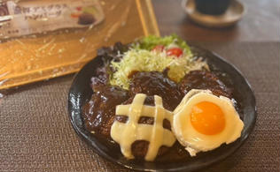 ハンバーグ単体でも濃厚なデミグラスソースがたっぷりで十分なのですが、トッピングをしてみます。