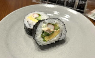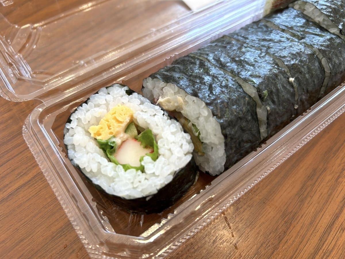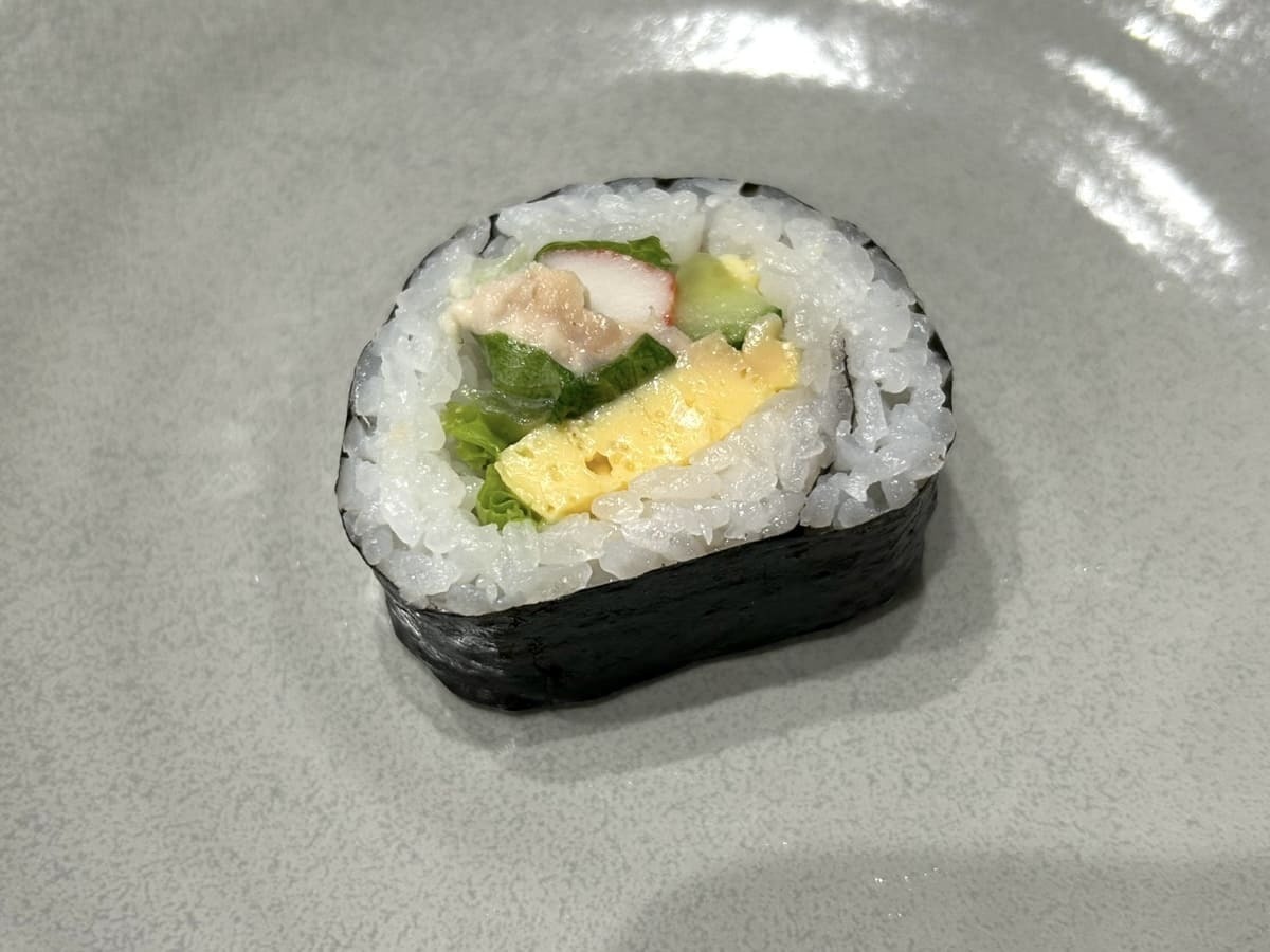 ご飯は酢飯、具材は卵焼き、シーチキンマヨ、リーフレタス、きゅうり、カニカマが入った定番構成です。