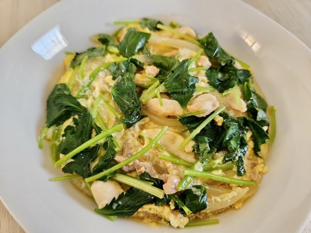 鶏肉にしっかり火が通ったら卵を回しかけて三つ葉をのせます。