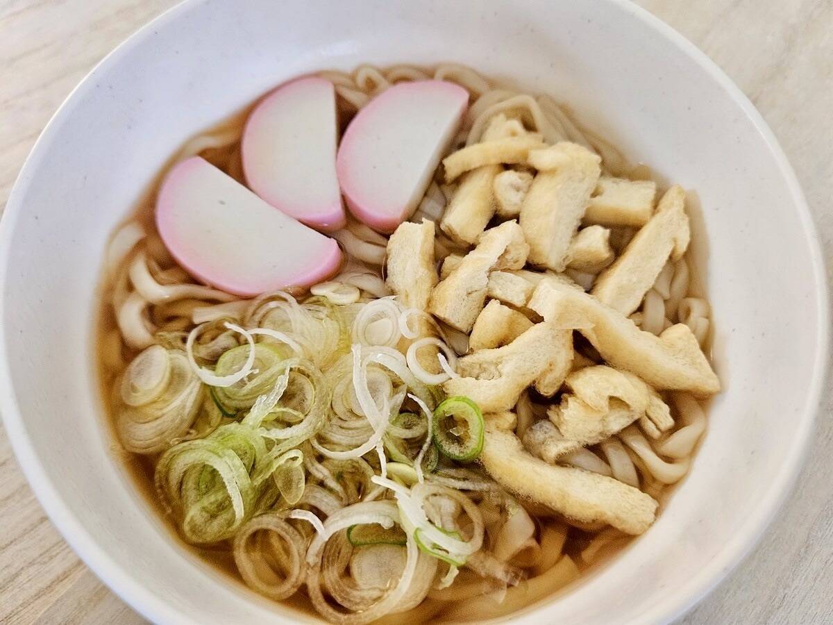 沸いたかけつゆを麺にかけて、薬味などを盛り付けたらあっという間に『かけうどん』ができました!
