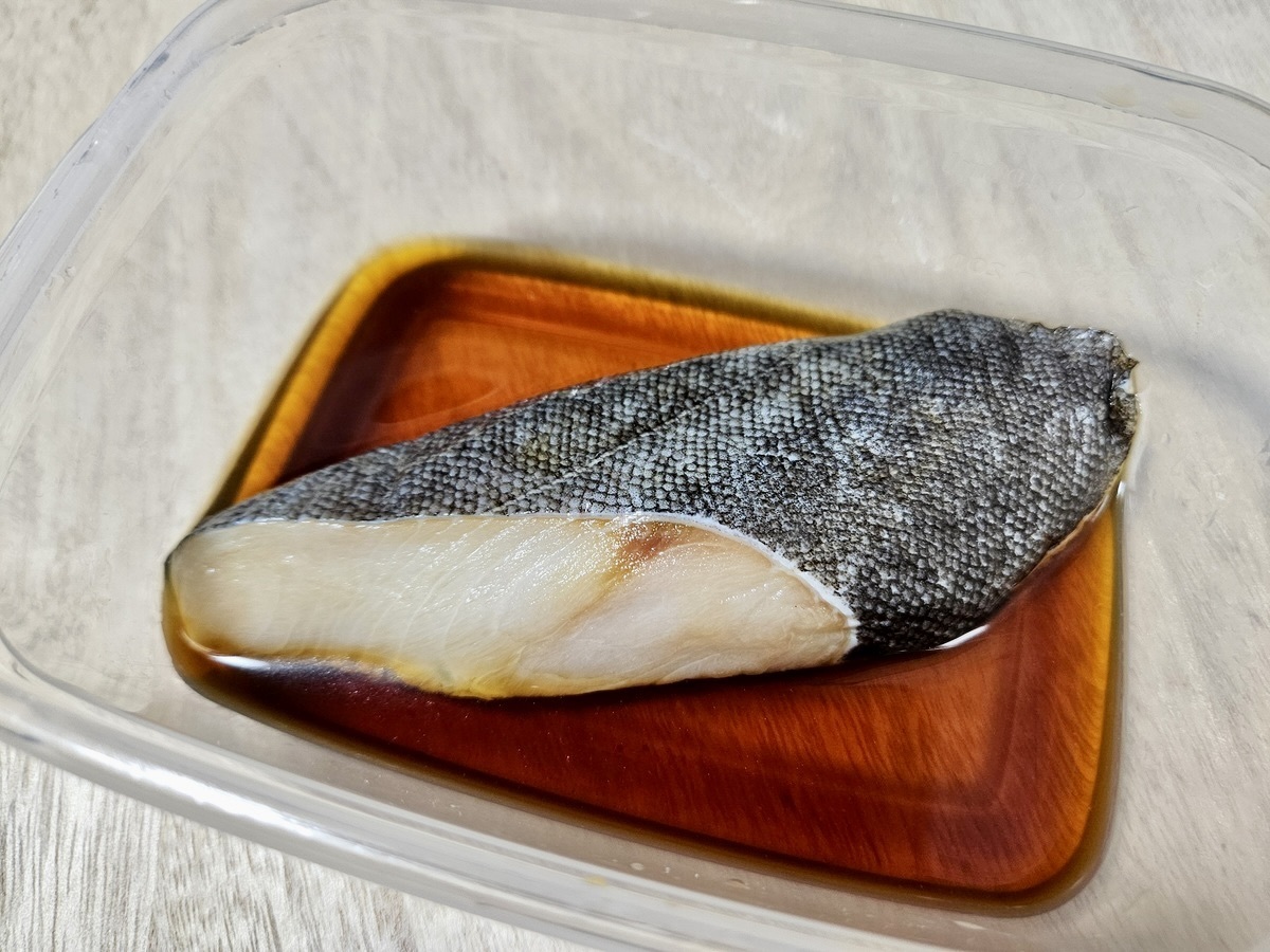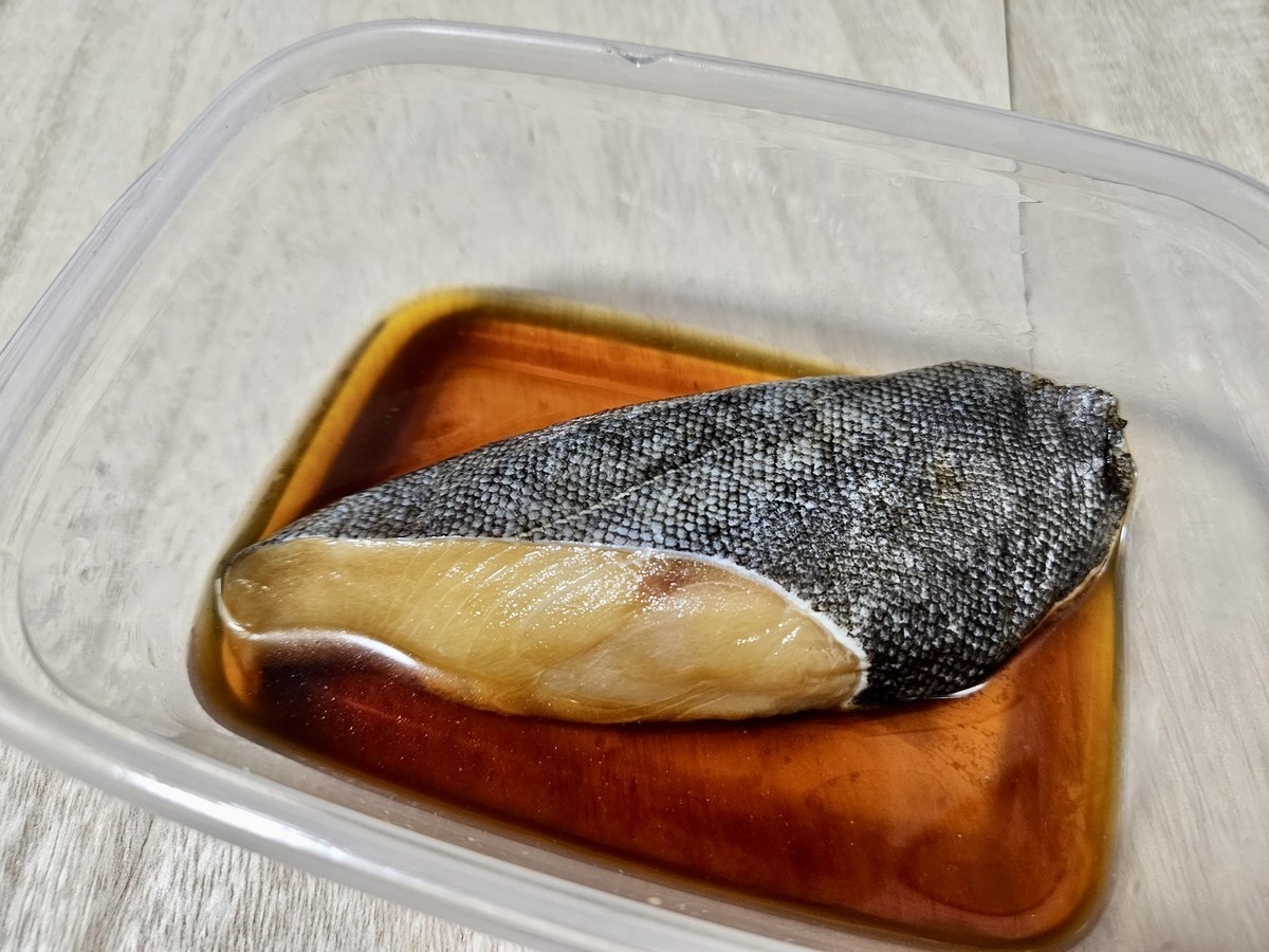 まず、めんつゆに銀たらを漬けます。めんつゆ大さじ5のみ。