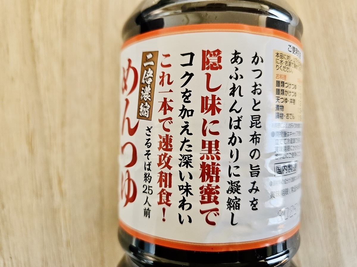 かつおと昆布に加え、砂糖ではなく“黒糖蜜”というのが、この「めんつゆ」のポイント。