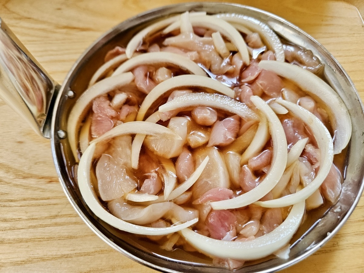 作ったつゆに鶏肉と玉ねぎを入れて火にかけます。