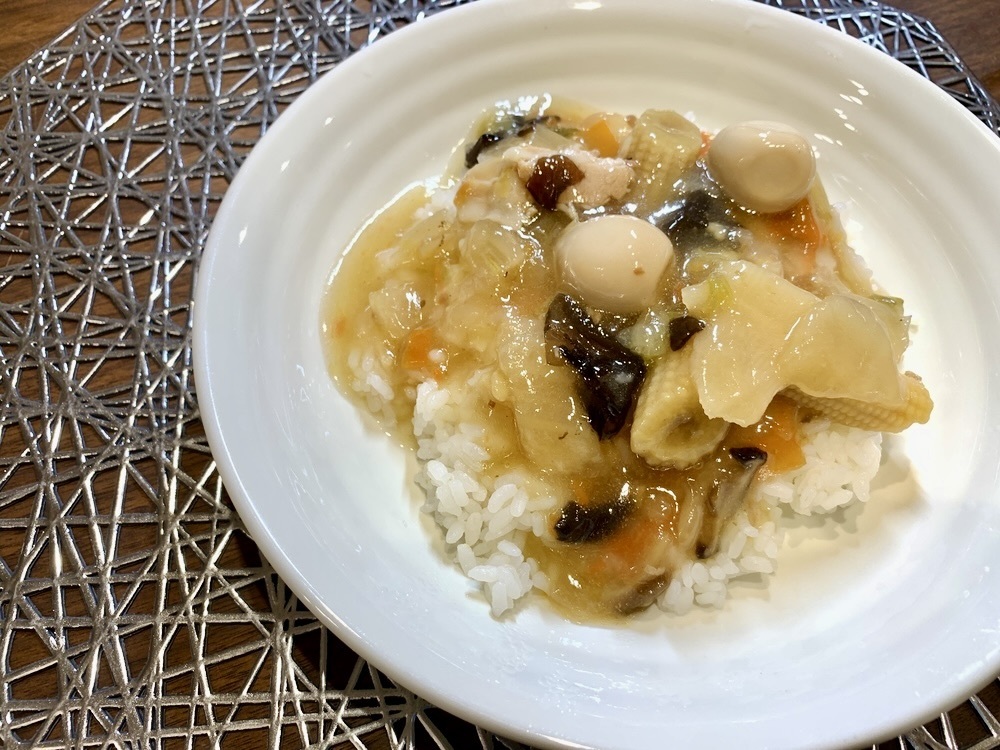 数種類の野菜・うずらの卵など、具材のボリュームが満点の無印良品の「ごはんにかける八宝菜」。