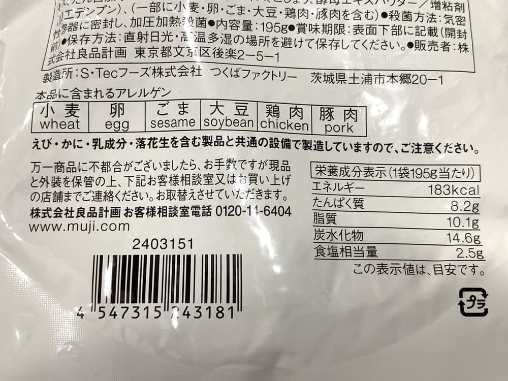 アレルギー物質については、小麦・卵・ごま・大豆・鶏肉・豚肉が含まれています。
