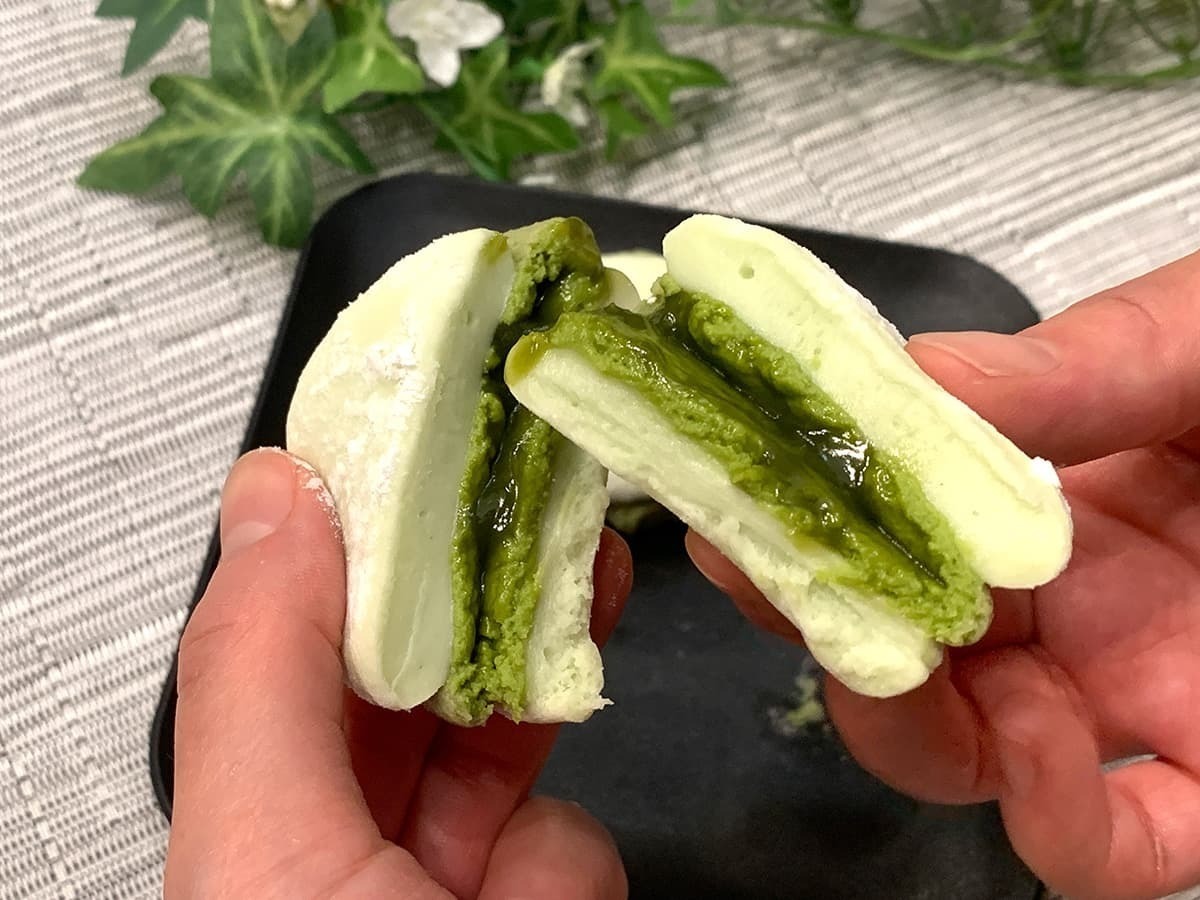 ふわもちの生地に、宇治抹茶ペーストとクリームを混ぜ合わせた抹茶クリームがサンドされた一品。