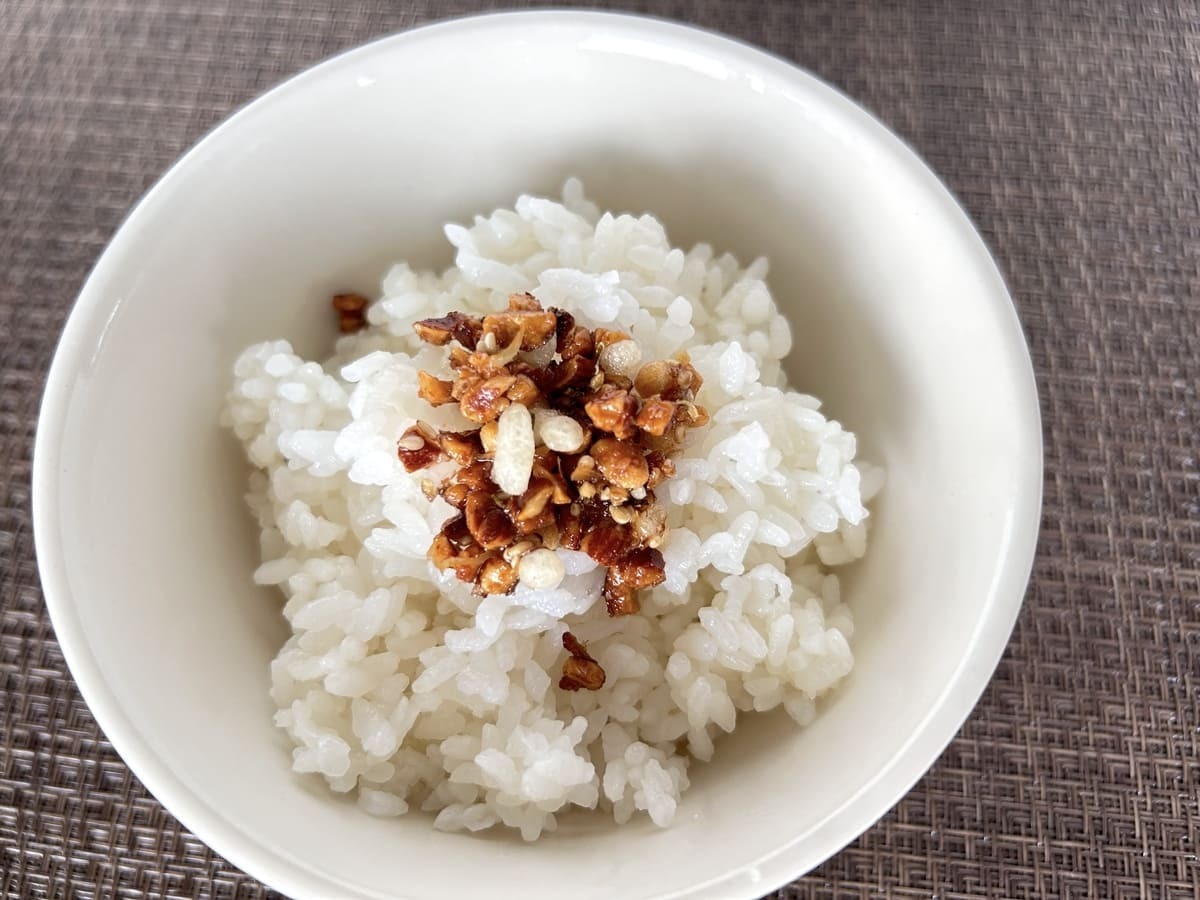 筆者は中華風の炒め物の上に載せましたが、辛味と香ばしさが加わり美味しさがアップしました。
