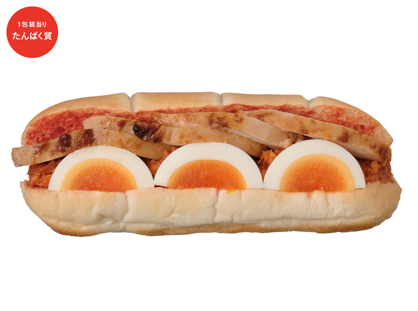 ローストチキン、半熟ゆで玉子、チリソイミートを組み合わせたロールパン。