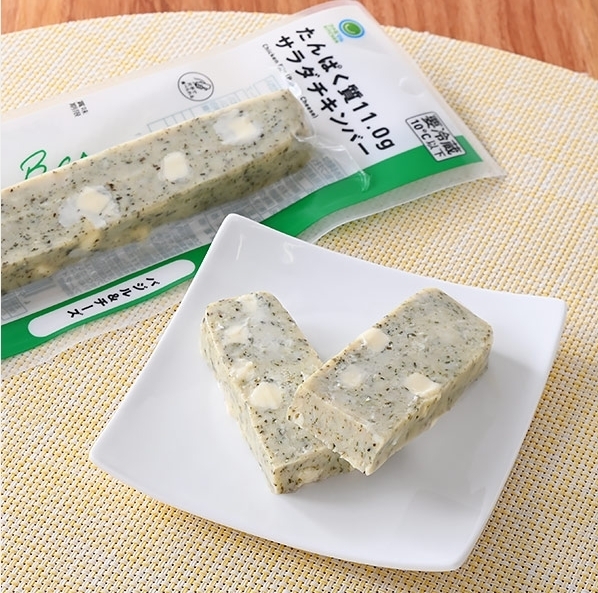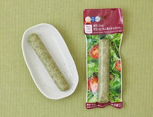 枝豆とほうれん草を使用し、スティック状に仕上げられたサラダチキンです。