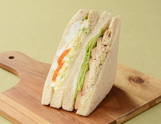 全粒粉入りの食パンに、ローストチキン・レタス・ブロッコリー入りたまごサラダをサンドした一品。