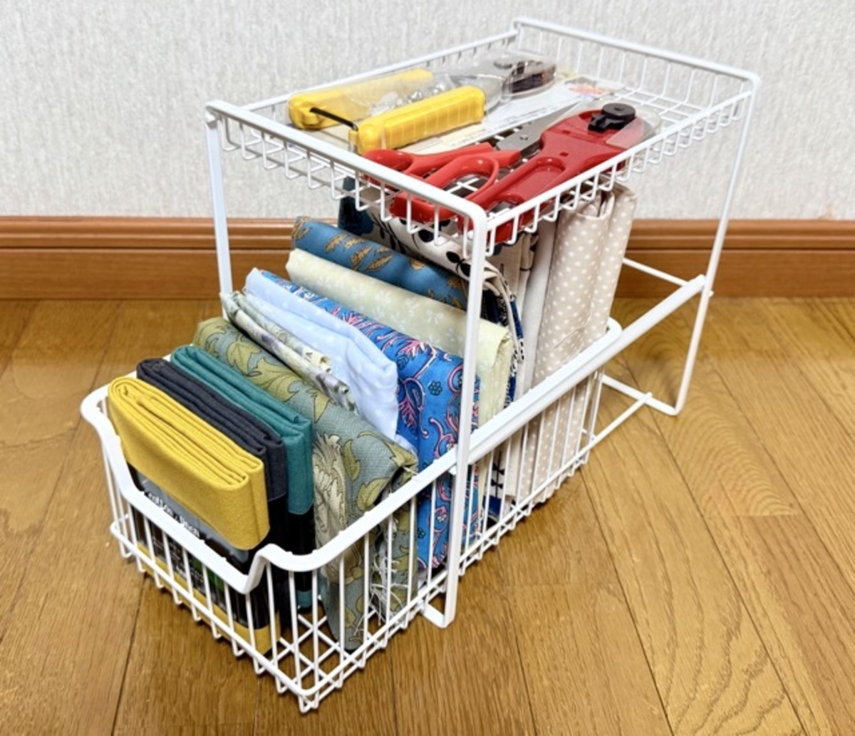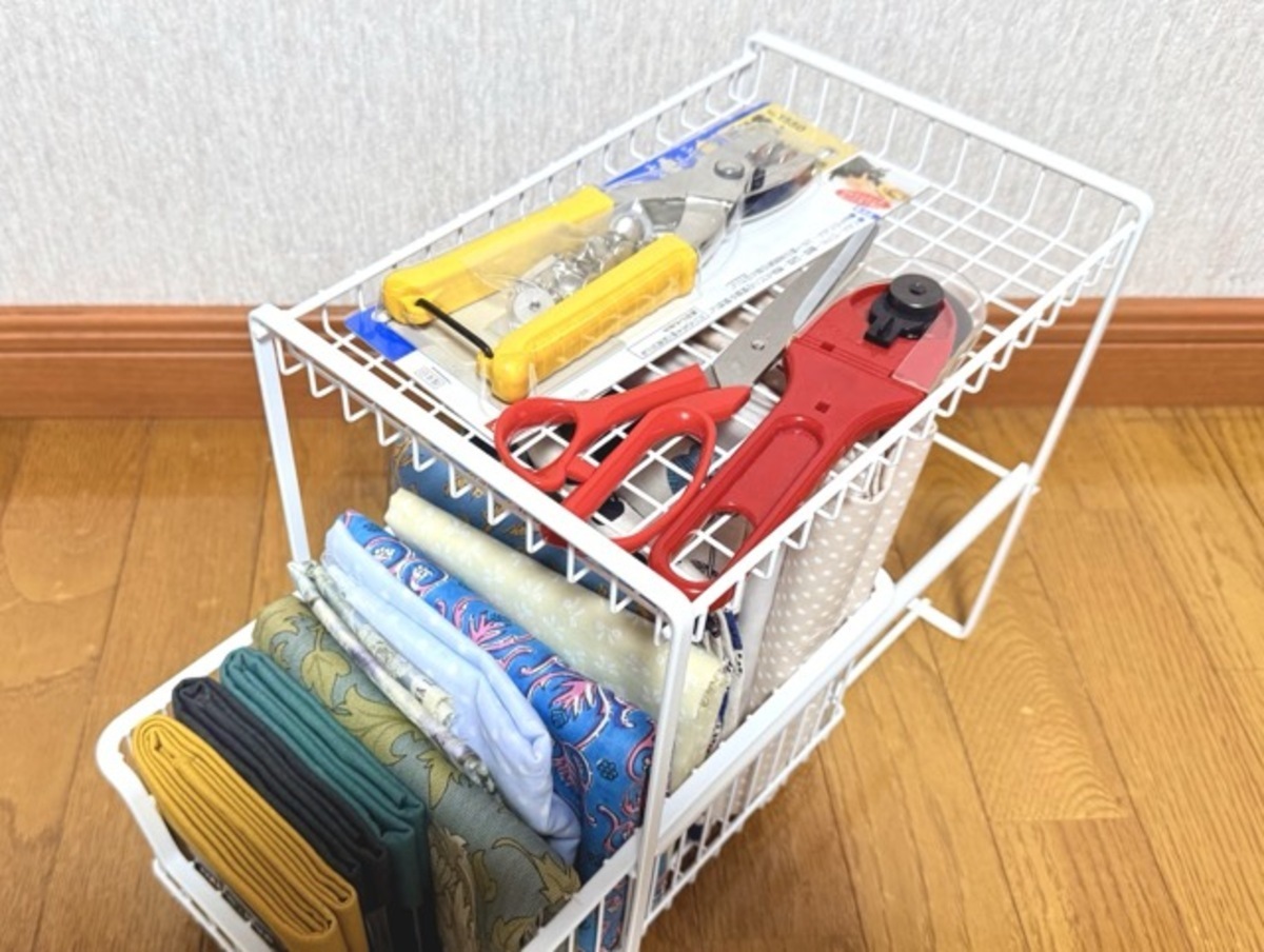 上段には裁ち鋏やロータリーカッターを置いて、ちっちゃな生地屋さん気分で使っています。使うときにサッと取り出せるし、通気性がいいので傷みづらいのも嬉しいところ。見た目がスッキリしたせいか、創作意欲も上がった気がします。