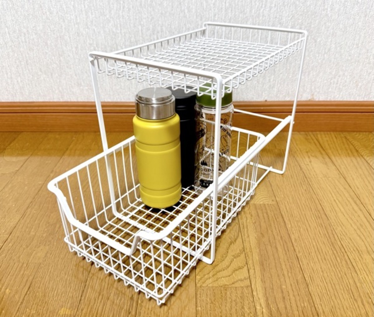 スチール製なので見た目以上にタフで、調味料の瓶など少し重めのアイテムも余裕でOKです。