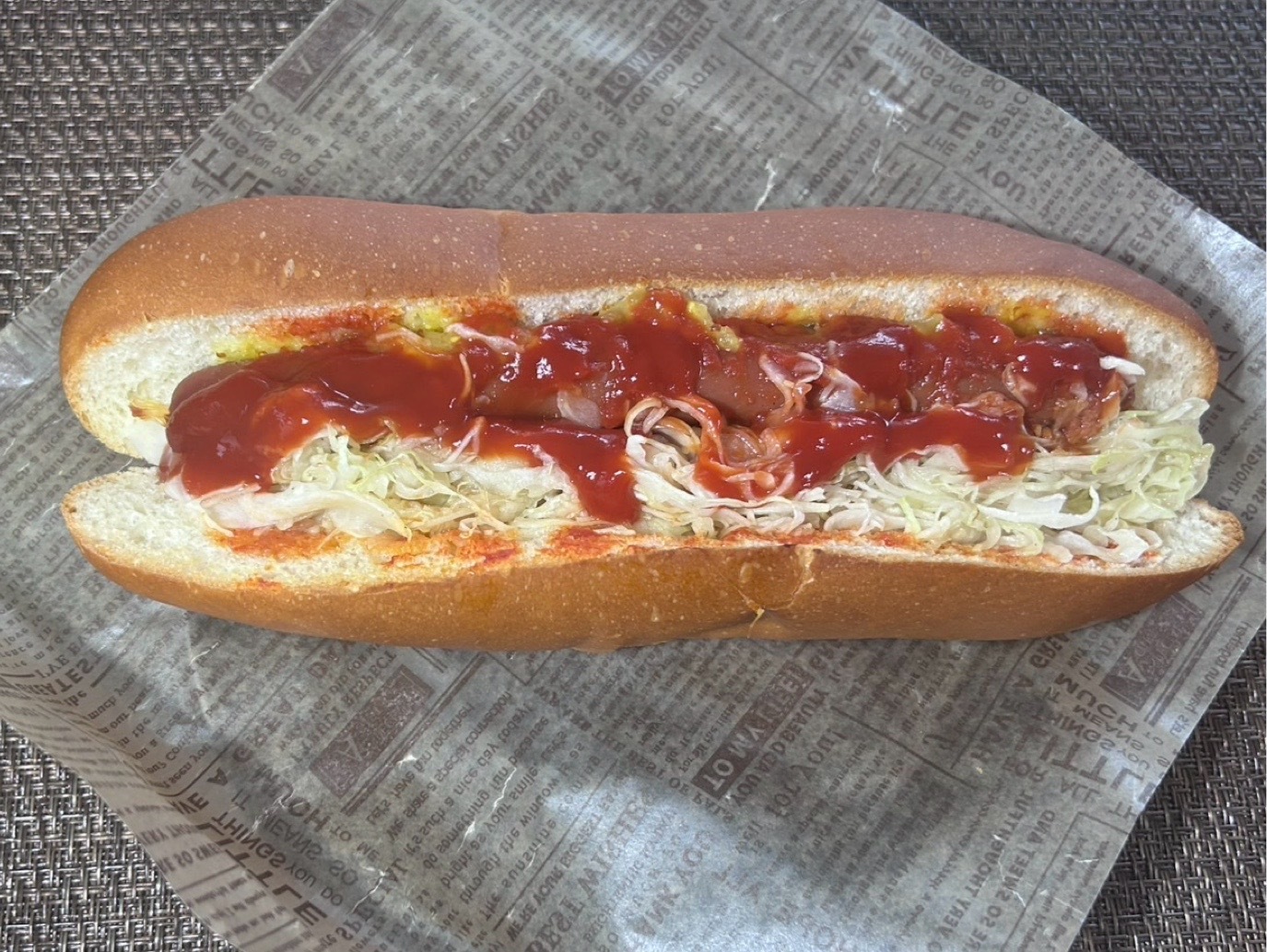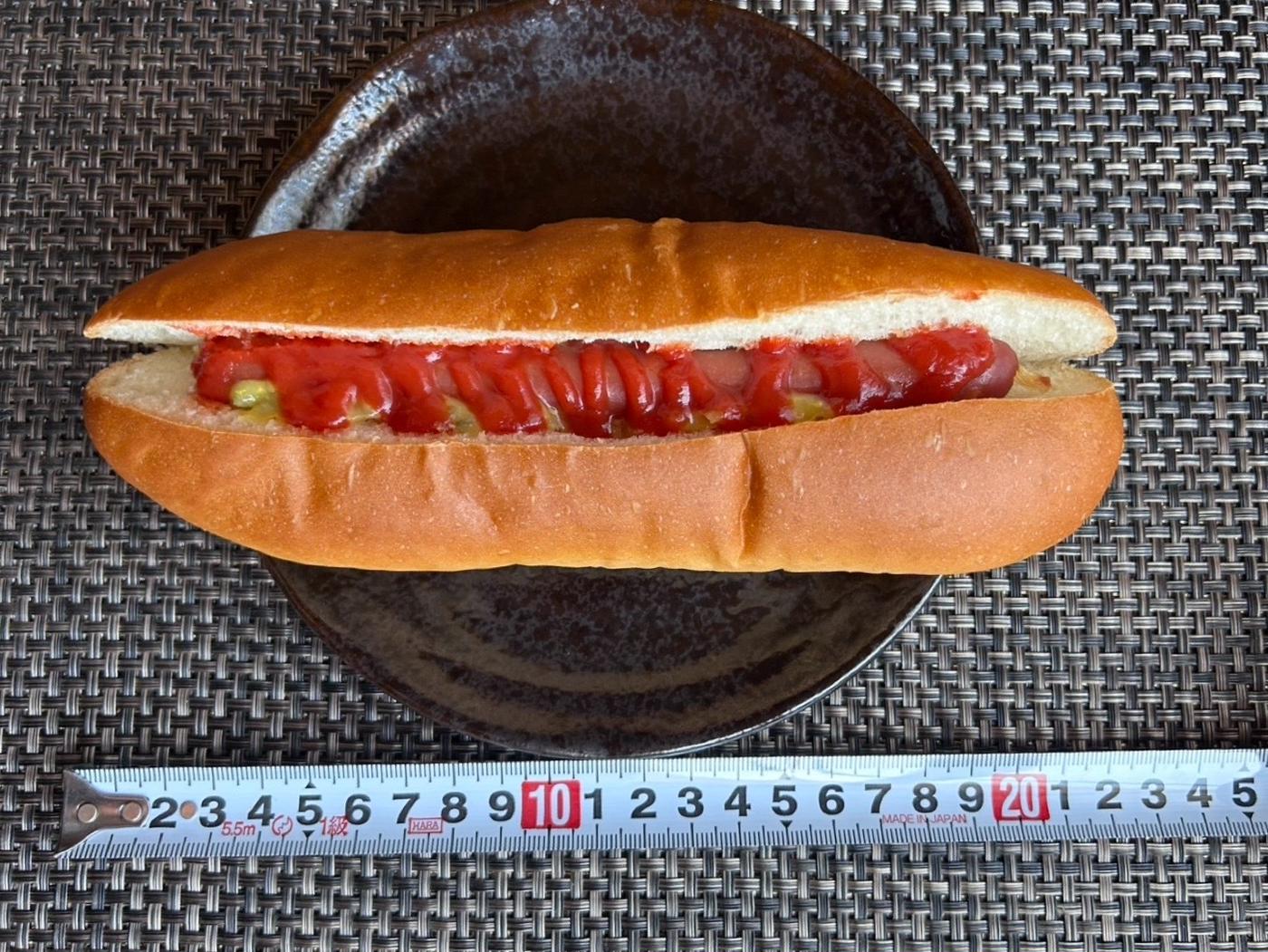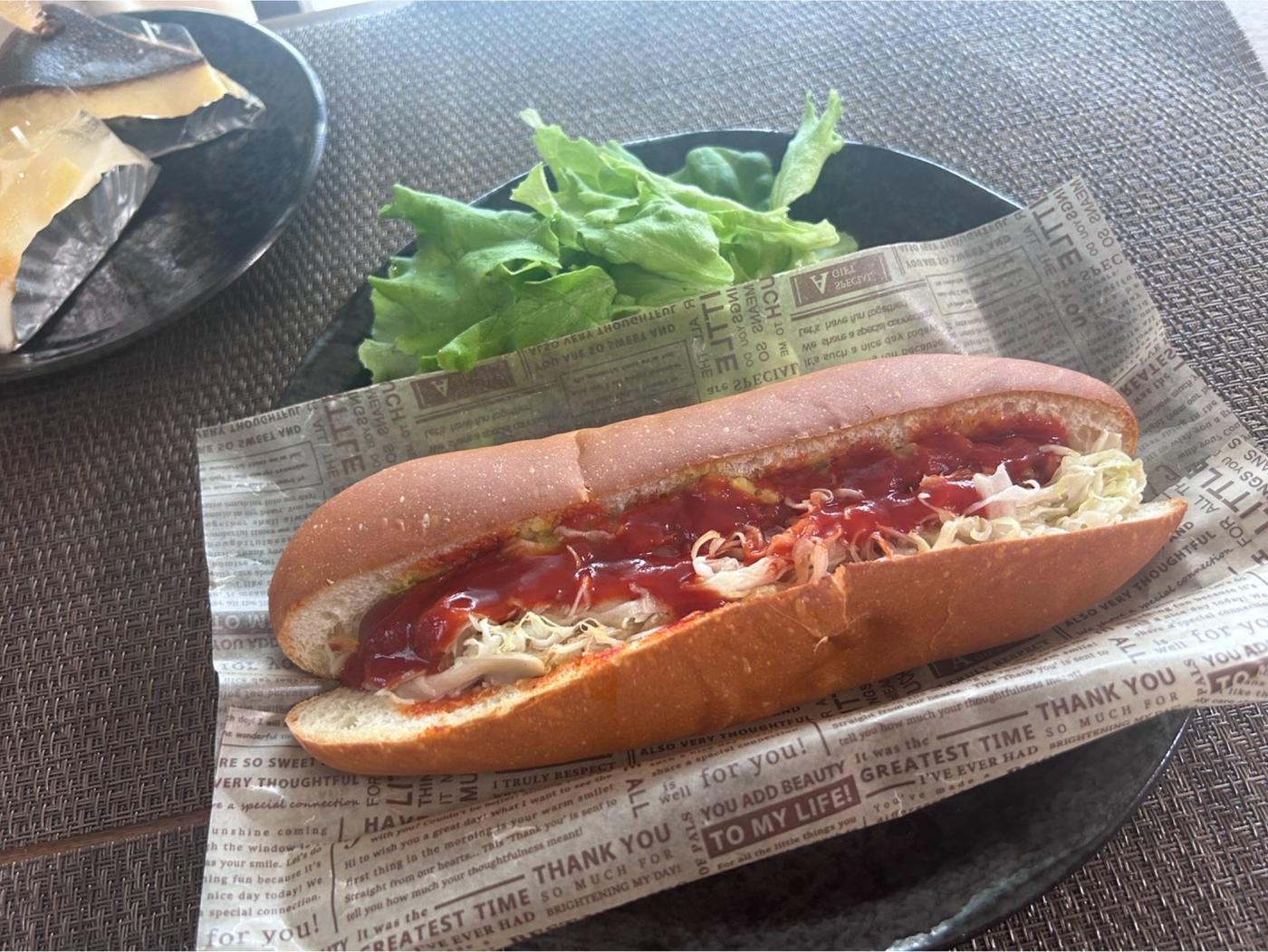 ふんわりしたコッペタイプのパンに、ソーセージがまるっと一本。切れ目からケチャップとマスタードがのぞき、見た目はシンプルでも食欲をそそります。