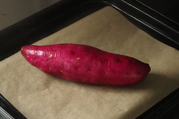 オーブンを150℃に予熱します。天板にオーブンシートを敷き、さつまいも(1本200g程度のもの)を並べて150℃で30分焼きましょう。