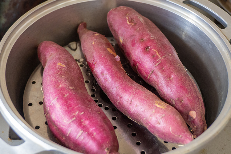 水に溶けやすいカリウム、皮に含まれるアントシアニンなどの栄養素は、茹でるよりも蒸した方がさつまいもにとどまります。