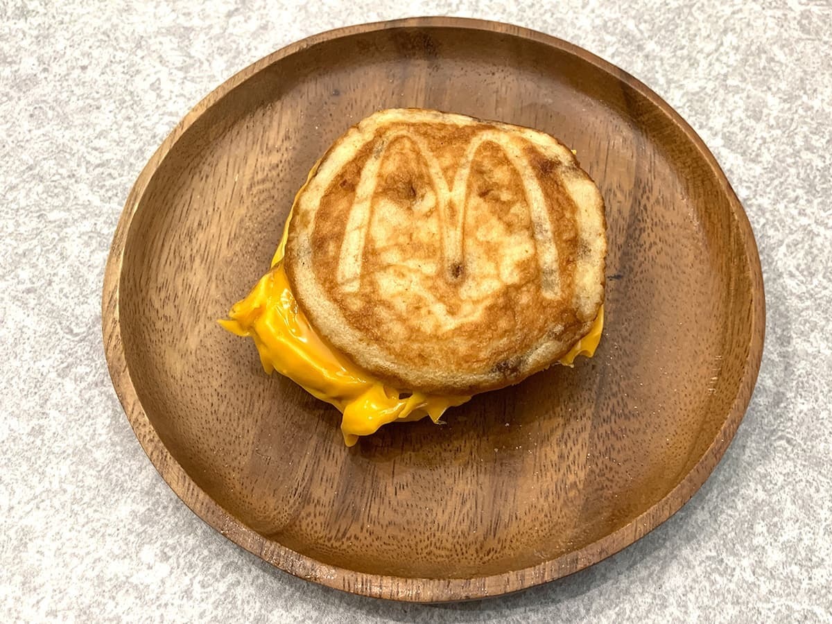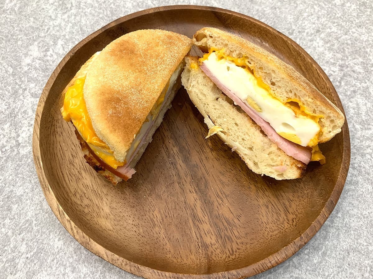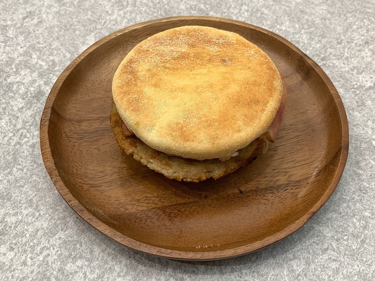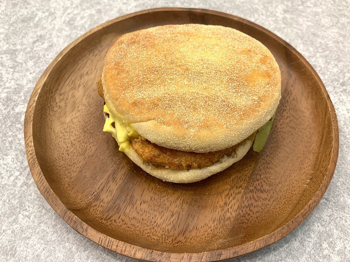マクドナルドのモーニングとレギュラーメニューの大きな違いとして挙げられるのが、具材を挟んでいるパン。モーニングでは丸く平たい形をしたイングリッシュマフィンを使用しており、表面をカリッと香ばしく焼き上げているのも特徴的です。