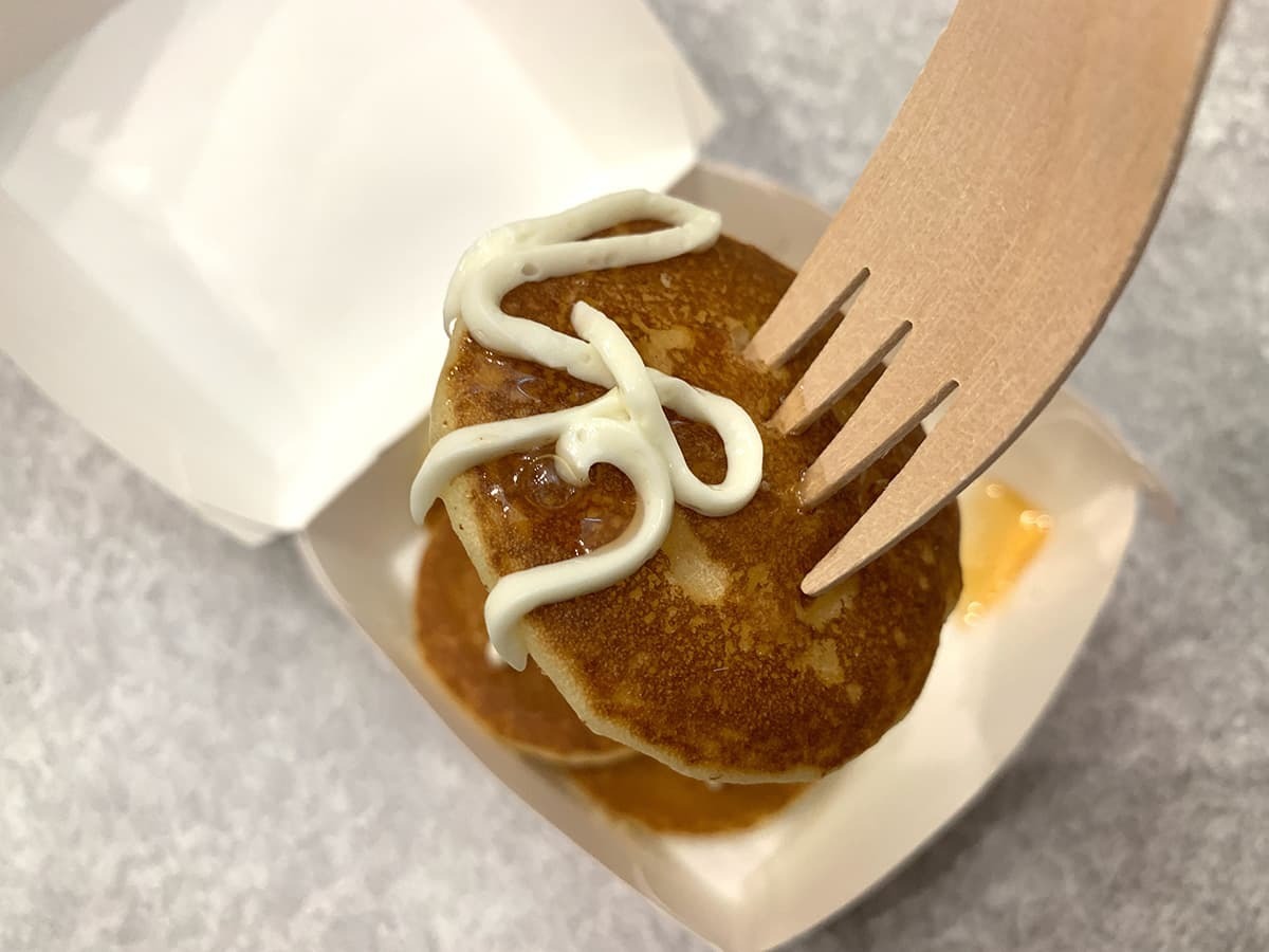 パンケーキからはメイプルの甘い香りが漂ってきて、今からデザートを食べるような感覚。しかし、カットした断面はたまご、ベーコン、チーズとバーガーでよく見る組み合わせなので、少し不思議な気持ちにもなりました。