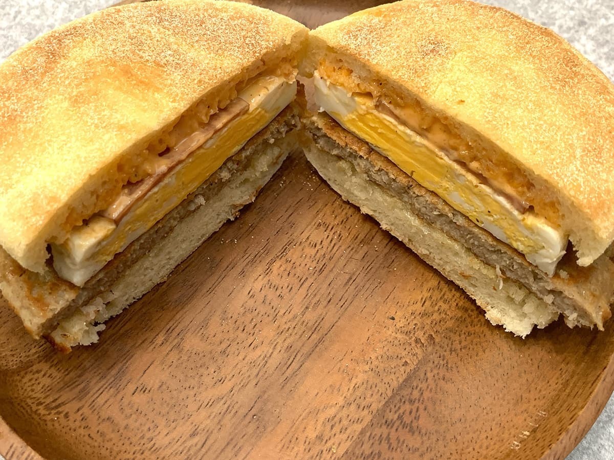 バーガーをカットしてみると、分厚いたまごやソーセージパティがお目見え!ボリューミーな仕上がりで、朝からガッツリ食べたい方にぴったりですね♪