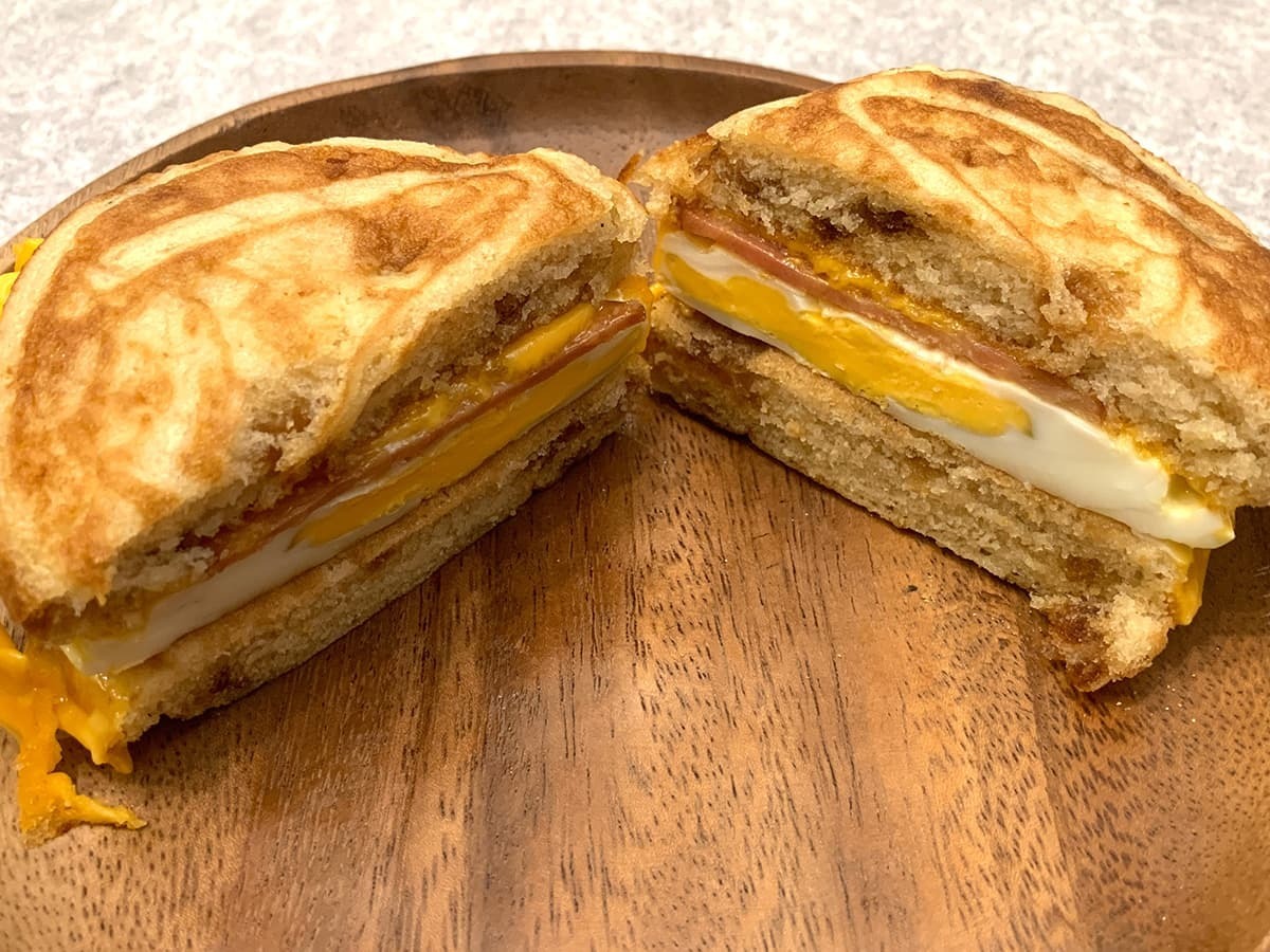 たまご、ベーコン、チェダーチーズをメイプル風シロップ入りのパンケーキで挟んだ一品。バンズやマフィンではなく、パンケーキで具材を挟むという少し変わった商品となっています。
