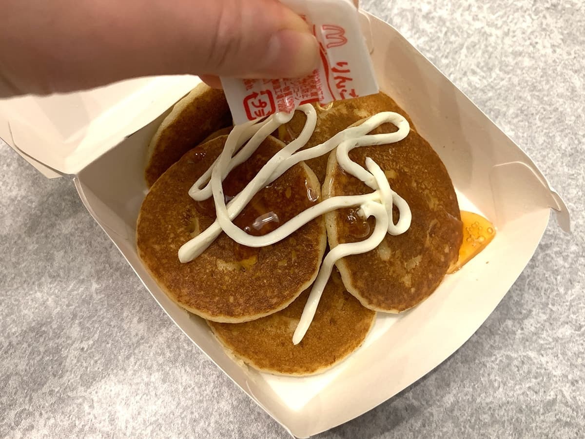 りんご&クリームのソースが付いているので、片手でパキッと割ってプチパンケーキにかけていきます。