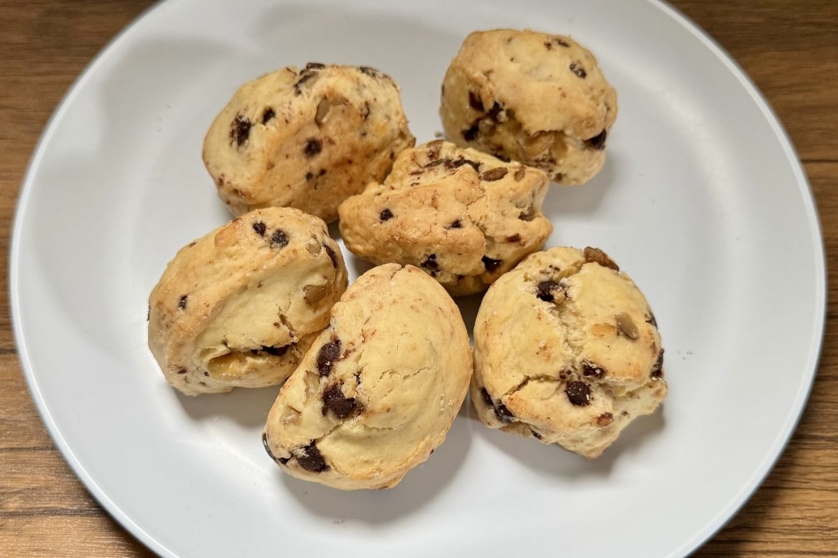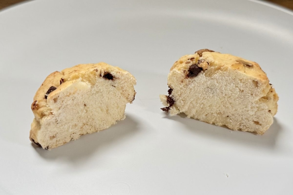 そのまま食べみると、スコーンの生地は、バターの風味と素朴な甘みが美味しい味わい。想像以上に、チョコチップと胡桃がたっぷりと練り込まれていました。