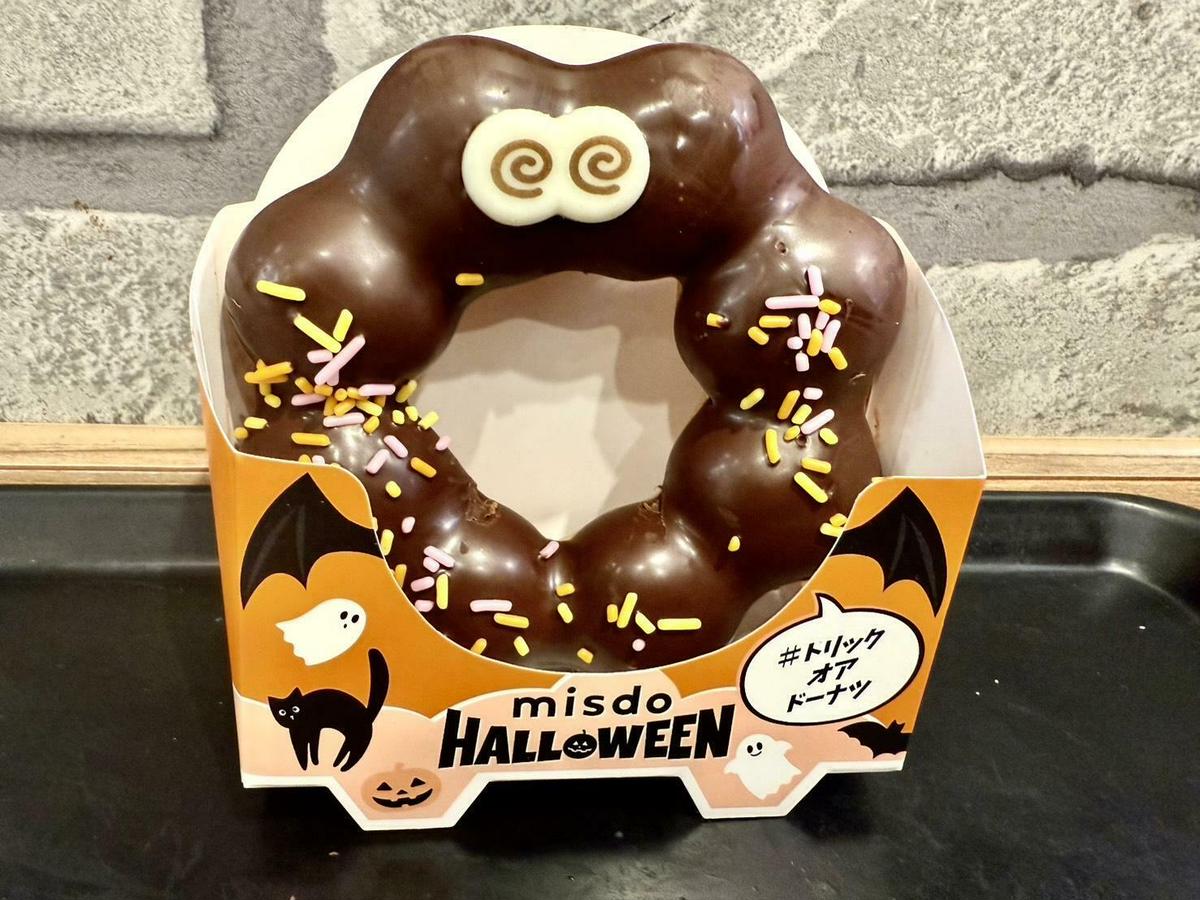 チョコレートでコーティングされたポン・デ・リングの上にはハロウィンカラーのチョコスプレーがザクザクで、もっちり生地とチョコレートの甘み、チョコスプレーのザクザクの食感で、黒幕らしからぬ優しい美味しさが特長です。