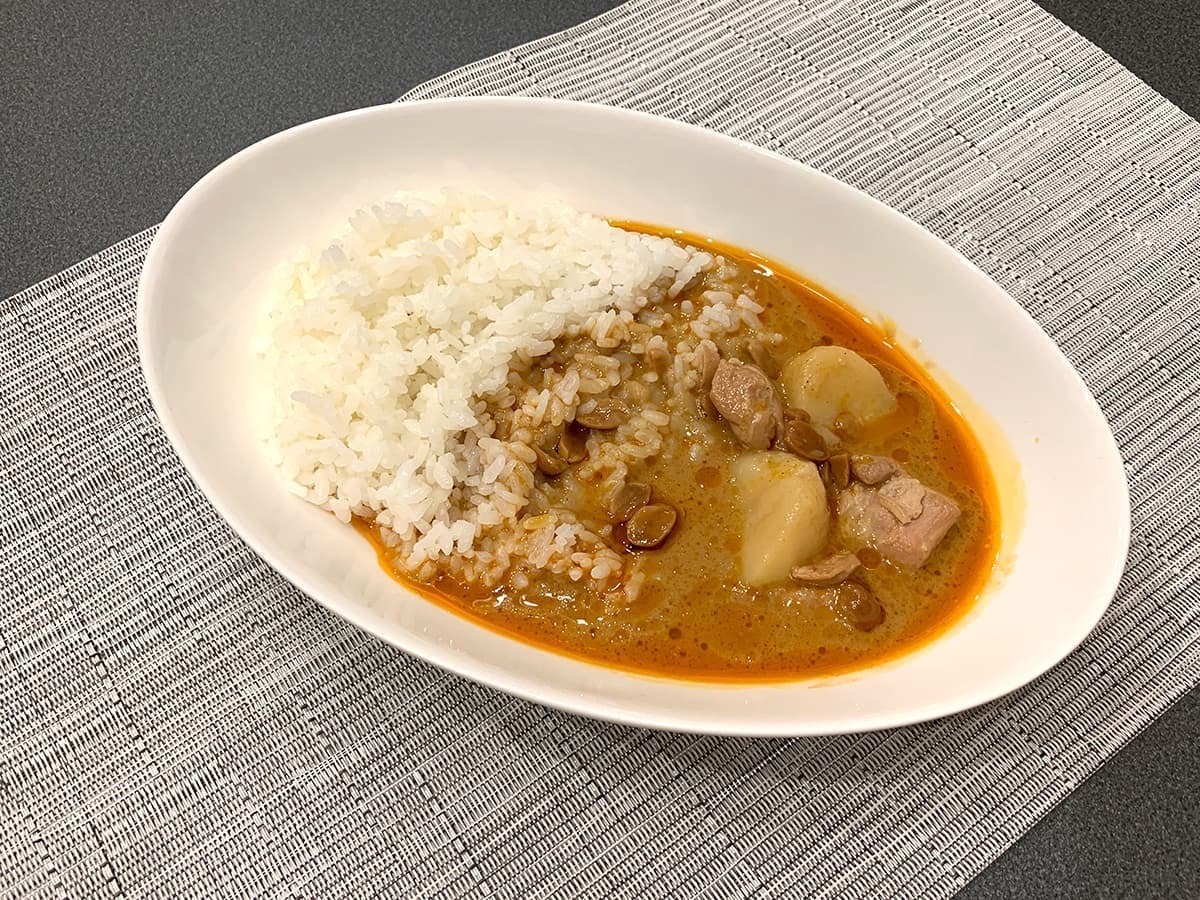 ココナッツミルクを使用しているのが特徴で、お皿に注ぐとサラサラとしたルーに赤い油分が浮かぶエキゾチックな色合いです。