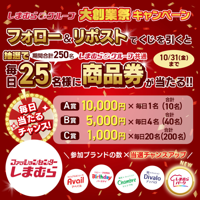 しまむらグループの大創業祭、ならびに、しまむらパーク(オンラインストア)の開設を記念して、グループ内の6つのX公式アカウント(しまむら、アベイル、バースデイ、シャンブル、ディバロ、しまむらパーク)合同で、特別なキャンペーンを開催!