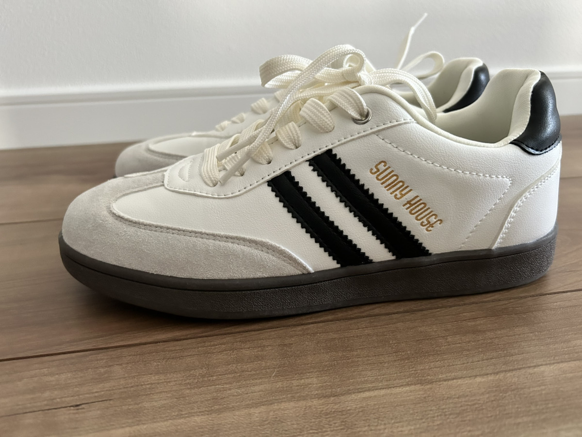 かかと部分のゴールドの「SUNNY HOUSE」刺繍が、さりげない高級感を添えています。2,420円という、3,000円を切る価格でトレンドのスニーカーが手に入るのは嬉しいポイントです。