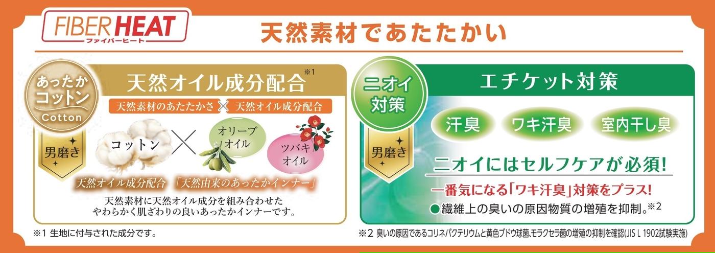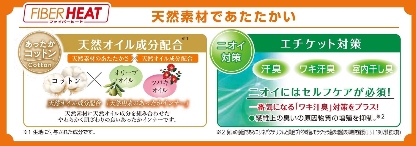 天然素材の綿に「天然オイル成分」を配合し、暖かさに加えてやわらかく肌ざわりの良いインナーです。