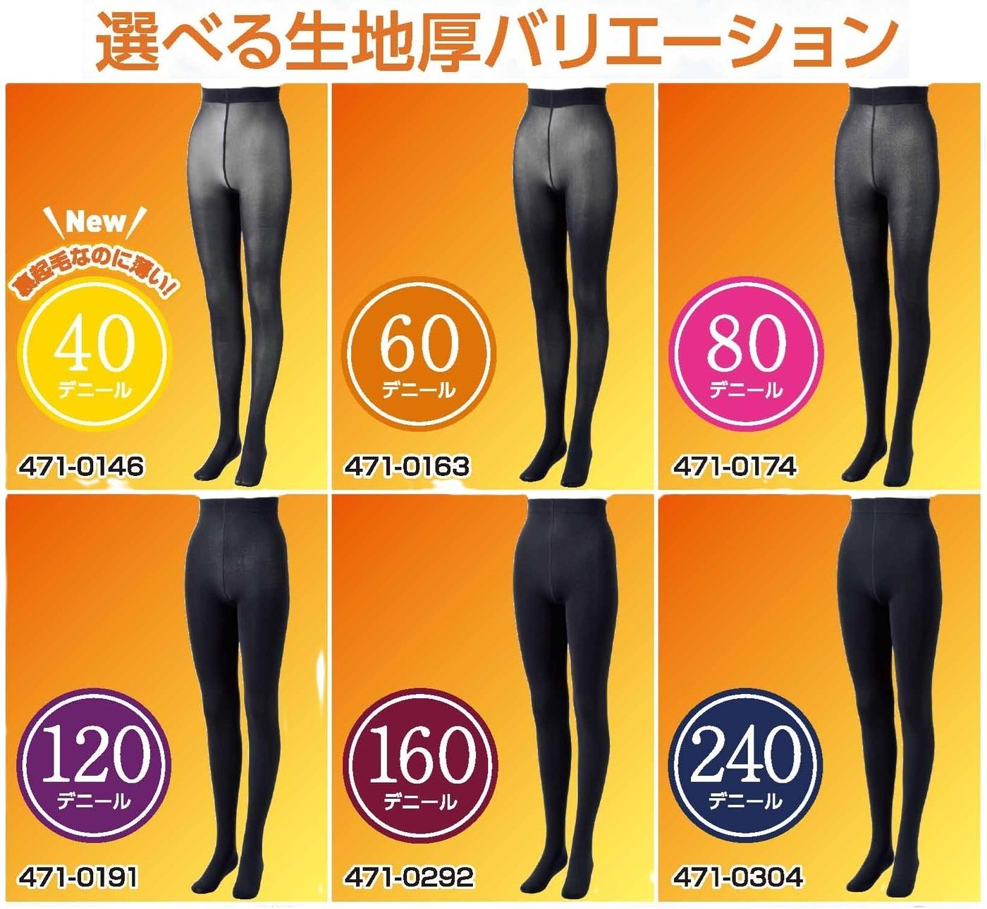 40、60、80、120、160、240デニールという多彩な厚さを用意し、今年は、シリーズの中で最も薄い裏起毛タイツ・レギンスとして「40デニール」が新たに登場。 ※7桁の数値は品番を表しています。