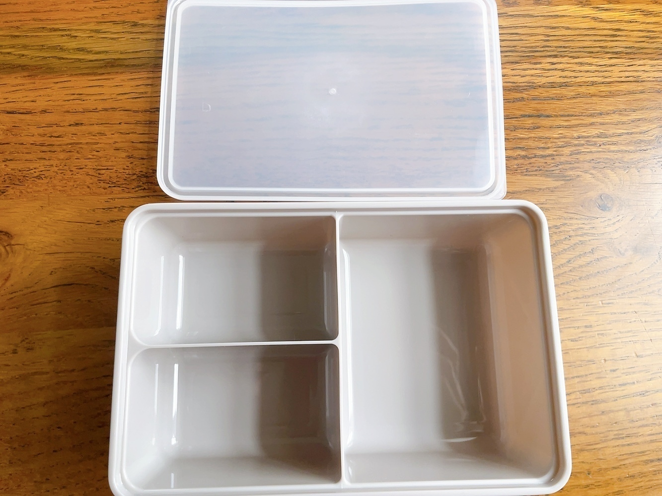 約幅112×奥行168×高さ52mmと、お弁当にちょうど良いサイズ感で、中には3つの仕切り(150mL×2、320mL×1)があります。