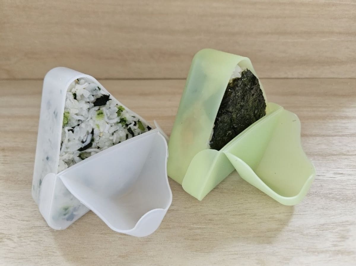 「シリコーンおにぎりパック」は、容器にご飯を詰めてフタをするだけで、手を汚さず簡単に三角おにぎりが作れる優れものです。