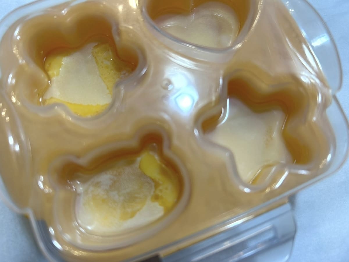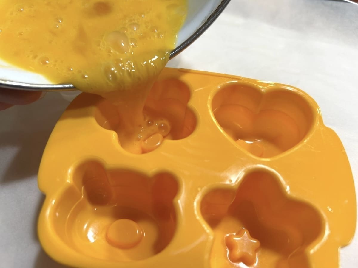 「レンジでミニ卵焼き」なら、電子レンジでチンするだけで、お花、ハート、星、クマの形の卵焼きが一度に4種類作れるんです!