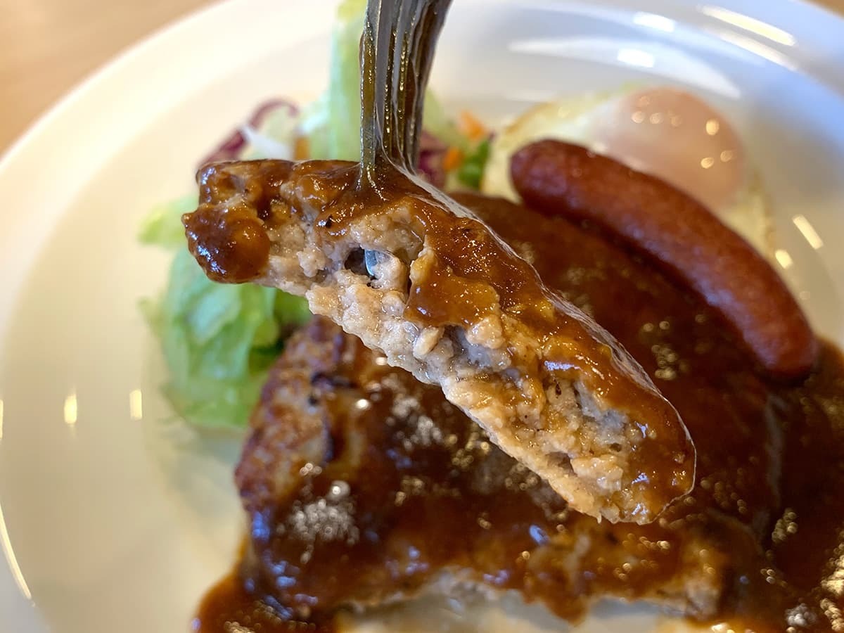 肉の味がしっかりしたジューシーなハンバーグで、ナイフがスッと入る柔らかさ!かかっているデミグラスソースもコクがあり、ハンバーグの肉の旨味を引き立てる美味しさです!