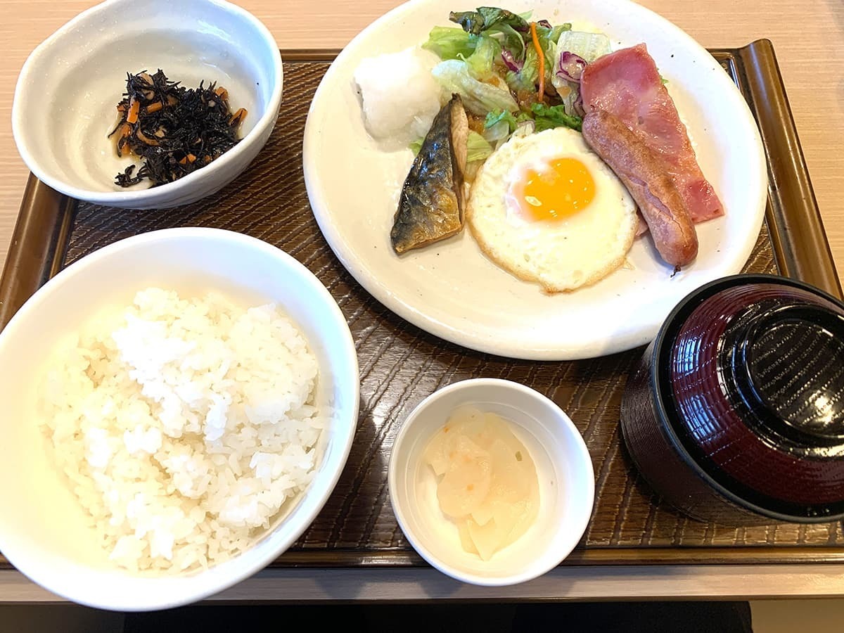 ご飯・味噌汁・焼き鯖・目玉焼き・ベーコン・ソーセージ・サラダ・ひじき・漬物がセットになった、まさに和の定食!ボリューミーな和定食を食べたい方にベストなメニューです。