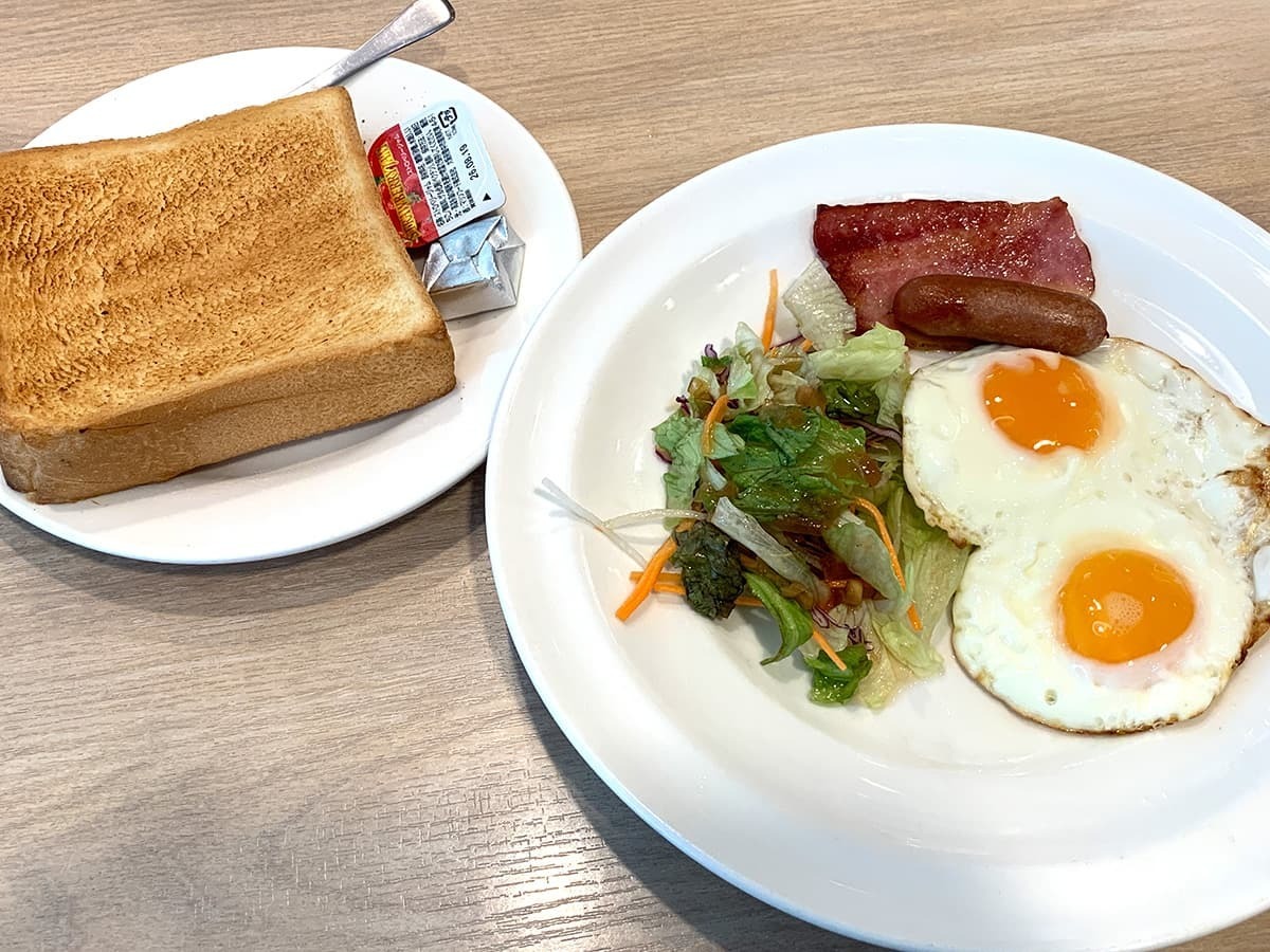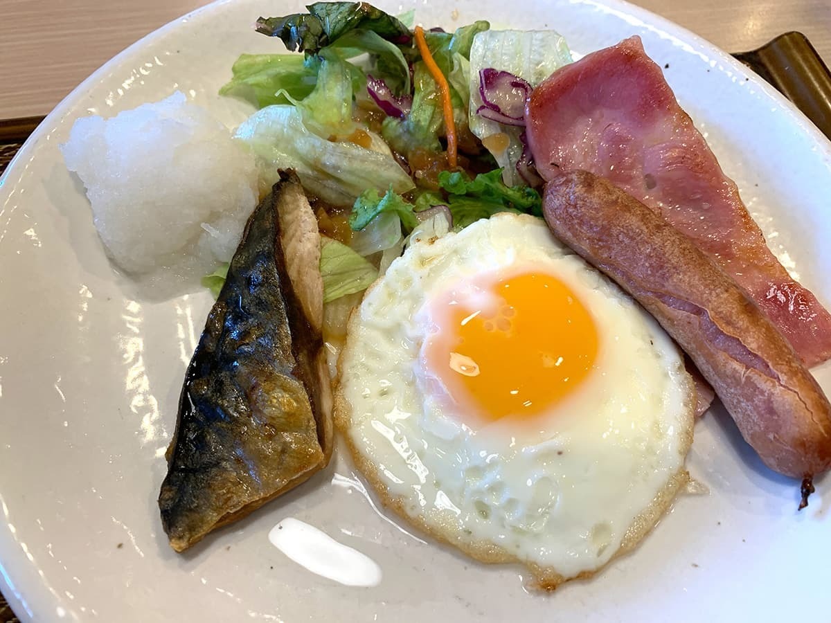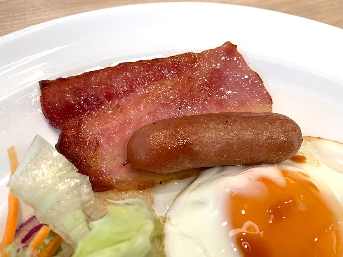 ベーコンとソーセージの塩気も、目玉焼きのまろやかさと相性抜群!塩気が目玉焼きのやさしい味わいを引き立たせ、まさに朝食の王道の組み合わせで美味しかったです♪