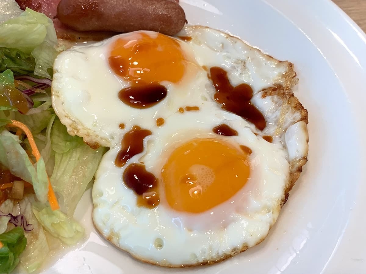目玉焼きは2個付いており、醤油をかけて食べてみました。黄身のとろ~り感と白身のぷるっ&カリッと感が美味しく、シンプルだからこそ飽きが来ない味わいです♪